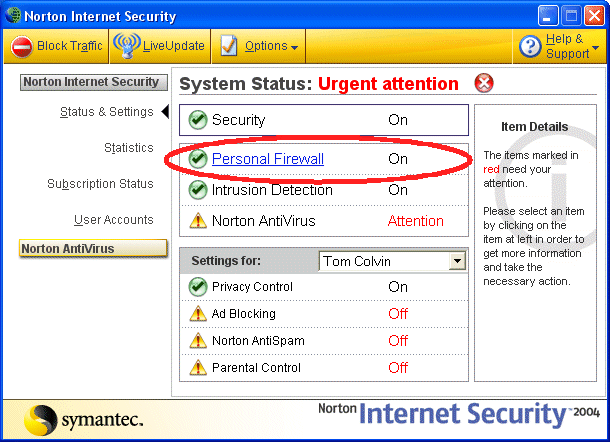 Step 2: In the main window of Norton Internet Security, click Personal Firewall as shown in fig 3.2 below