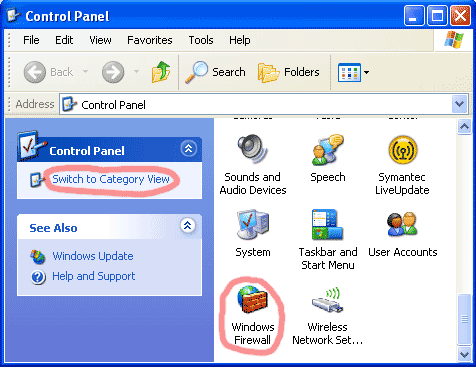 Step 2: Once the Control Panel has opened you need to double click the 'Windows Firewall' option that is circled in red below. Note you have to 'Switch to Classic View' to see the Windows Firewall icon,