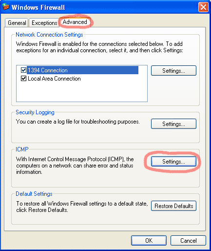 Step 3: Go to the advanced tab in the windows firewall window and choose the ICMP settings button (circled in red)