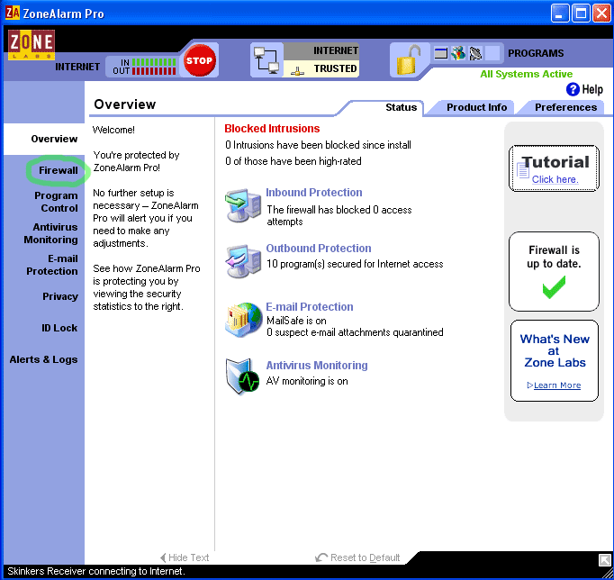 Step 2: In the main ZoneAlarm Pro you need to click the Firewall tab on the left hand side as indicated by the green circle