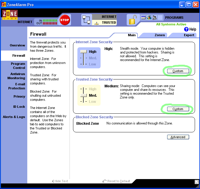 Step 3: Depending on what security section you are setup for then choose one of the 'custom' buttons circled in green below