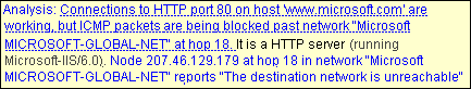 Fig 7.2: VisualRoute Analysis in Advanced ModeThis analysis section will explain in English what is going right or wrong in the trace. It will assist you in pinpointing problem areas in the trace. The blue underlined text in the analysis box can be clicked on for a fuller explanation of error messages.