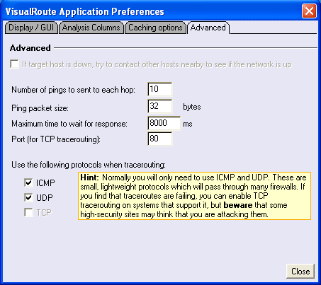 Display Advanced Analysis text - VisualRoute can display more information about a traceroute in an advanced analysis. By default the advanced analysis is turned on.