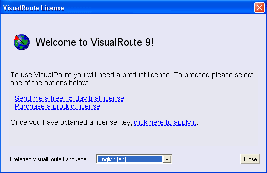 When you run VisualRoute for the first time, you will need to apply a purchased license key or a 15-day trial key, which may be obtained by selecting one of the options in the Welcome screen (Fig 3.1). You may also select your preferred language for VisualRoute. The language may be changed at any time under the "Options/Language" menu option.