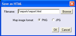 Save - The first icon on the toolbar is the save icon. By clicking this you will get the display below (Fig4.2.) This saves the table and map view as an html document. You can choose between two image formats also (PNG and JPG.) When OK is clicked it will bring up the HTML document for you to view. The default folder for saving is the VisualRoute install folder.