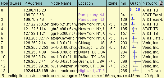 Hop The trace route hop count. % Loss This shows the percentage of ping packets that have been lost at this hop level. This number is red if a host is detected at this hop level. This means that ping packets are being lost. Otherwise, this number is black, because the host may just be ignoring all of our ping packets. This number is updated as the trace is completed, however if you should stop a trace before completion this value may not be totally accurate as VisualRoute may still have been waiting for responses from some of the ping packets that it had sent. IP Address The IP address of the host at this hop level. It is red if a recent ping packet was lost. It is blue when it matches a Loose Source Route IP address. Otherwise, it is black. The IP Address is bolded if it is the host that you are trace routing to. Node Name The reverse DNS lookup of the IP Address. Location The geographical location of the node. It is black if we are fairly certain of the node's location. Otherwise it is purple, meaning that the location is a best guess based upon information from various WHOIS databases. Click on the location for details. Tzone If the location of the node has been resolved then the time difference to your selected time zone will be displayed. You can change the base time zone that VisualRoute uses in Options -> Preferences -> Analysis Columns ms The average number of milliseconds (roundtrip) that it took for a ping packet to go from your machine to this hop level and back to your machine (just like the system 'tracert' program). Graph The blue line is a graph of the 'ms' column. The grey horizontal bar in each hop line represents the minimum and maximum millisecond times for that hop level. Network The network that this node is in, as reported by various WHOIS databases.