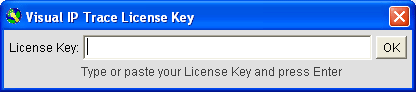 Make sure you copy and paste the key from your confirmation email into the license key dialog box to make sure the key is entered correctly. Once entered click the 'ok' button. Visual IP Trace will briefly communicate with a Visualware server to validate the key then the dialog box will disappear and the main GUI of Visual IP Trace should appear.